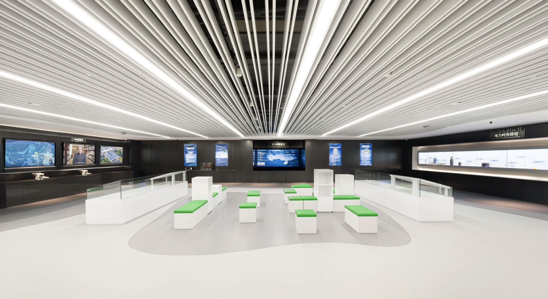 主展区沿墙面布置数字展项,融合层叠巨浪的造型,形成通厅式布局,弱化参观动线限制。内浅外深的配色既平衡了数字展项的冷峻感,又营造出会客厅般的舒适氛围。